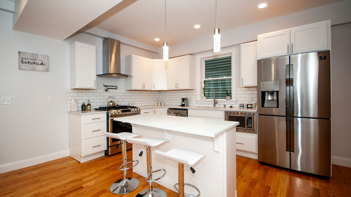 We created 4 beautiful, spacious and modern condos that features high ceilings, marble bathrooms, professional chef eat-in kitchen with designer quartz counter-tops, subway back-splash, high-end LG stainless steel appliances and elegant modern shaker cabinets. Sun-filled master bedrooms with bay windows and spacious mirror closets. New central A/C and heating system, washer and dryer in the unit, new electrical and plumbing, new rubber roof and windows, gleaming hardwood floors. The building is fully sprinkled and has storm management system in the yard.