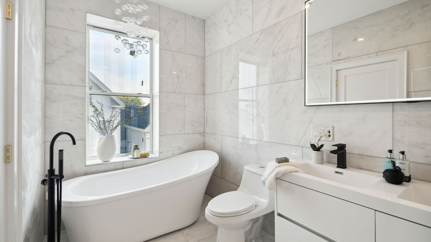 - Tiled designer bathrooms w/matte black fixtures, floating vanities and standalone soaking bath